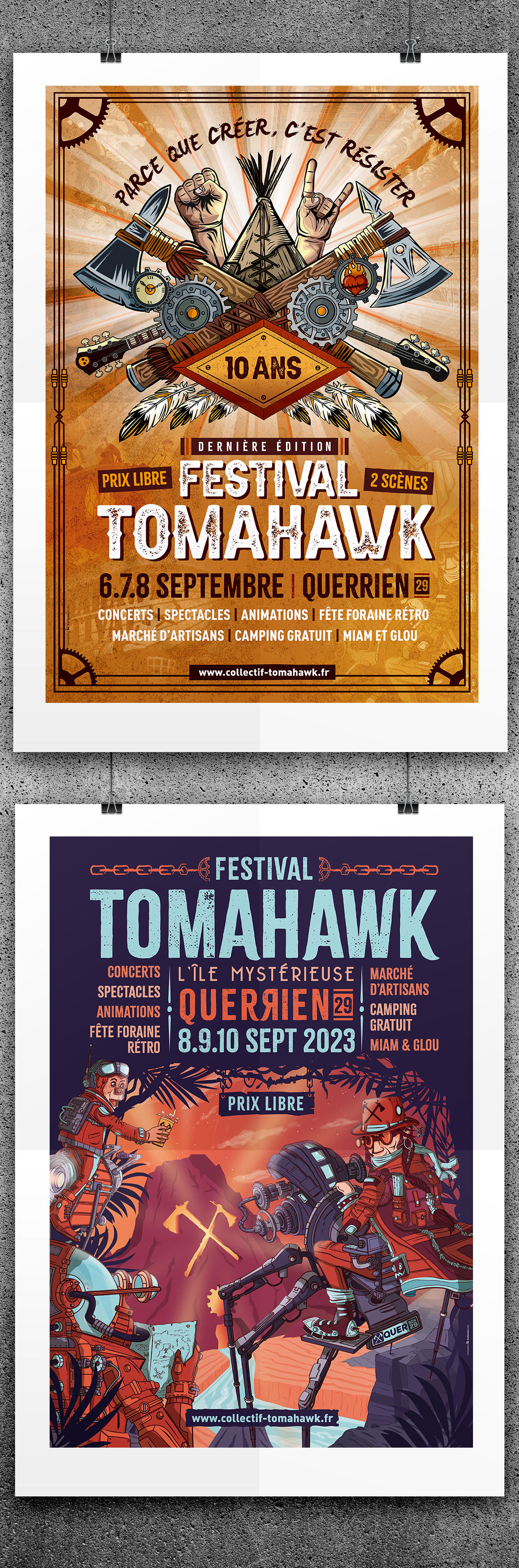FESTIVAL TOMAHAWK Création du visuel du festivalIllustration originale – Déclinaison supports variés Création du programme Précédent Suivant