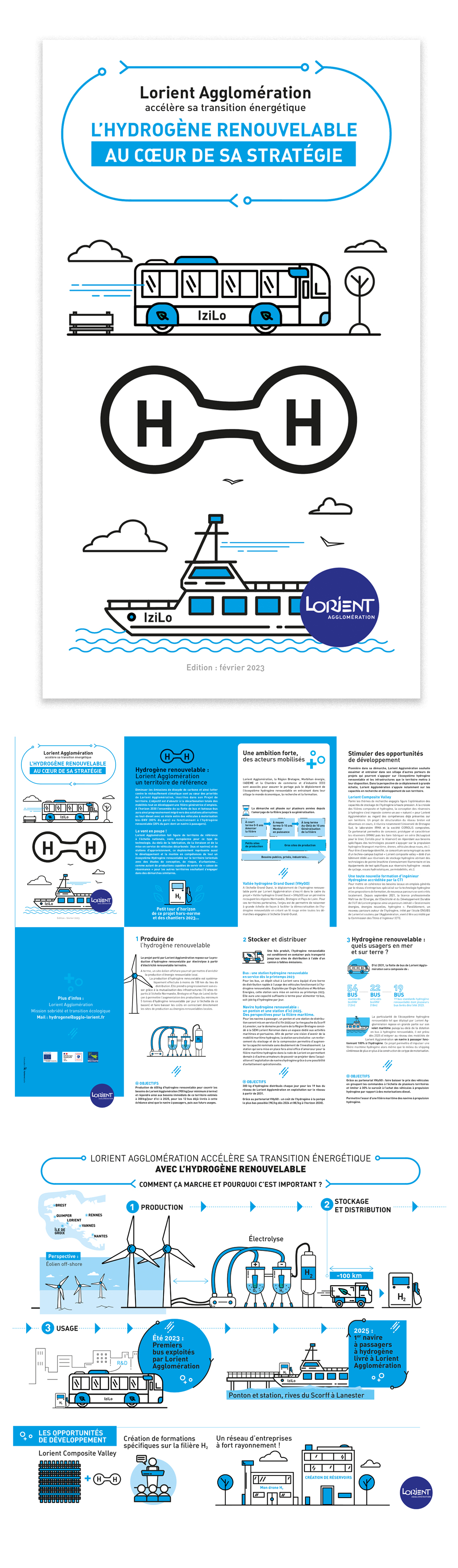 Lorient Agglomération Lorient Accélère sa transition écologique – HydrogèneDépliant 8 volets – Mise en page, pictogrammes et illustrations Précédent Suivant